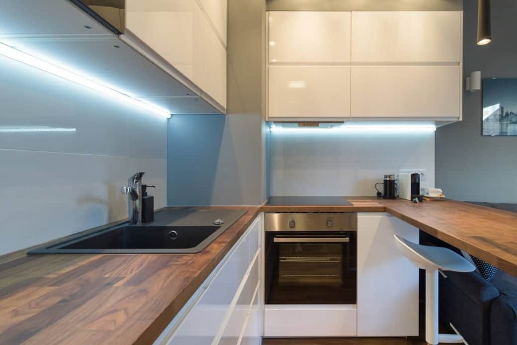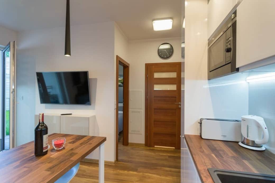 Kitchen stove, Kitchenette, Oven, Cleaning Products, Cooking basics, Dishes and silverware, Freezer, Hot water kettle, Wine glasses